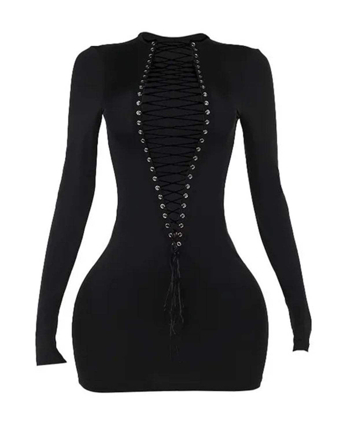 This sleek Black Lace-Up Mini Dress features a lace-up front design and a figure-hugging silhouette.