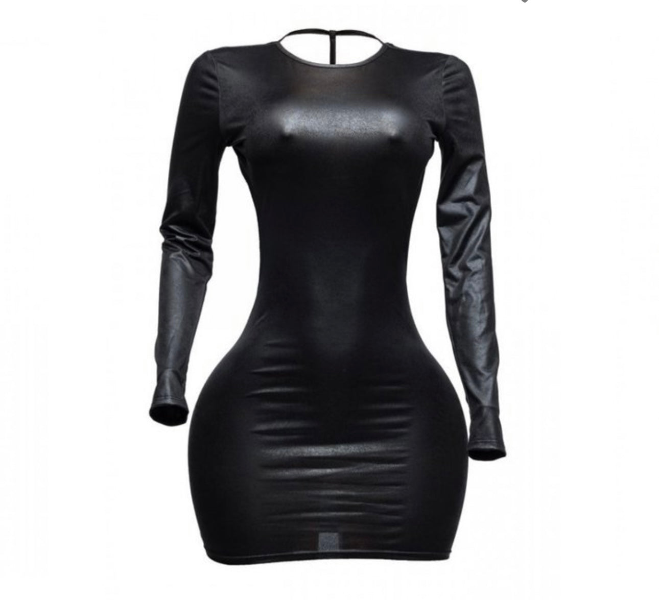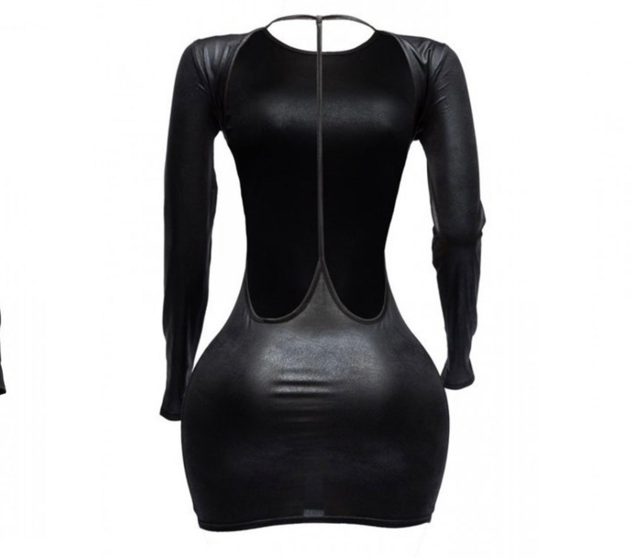 Vegan leather black bodycon dress. Form-fitting silhouette with back cut out.