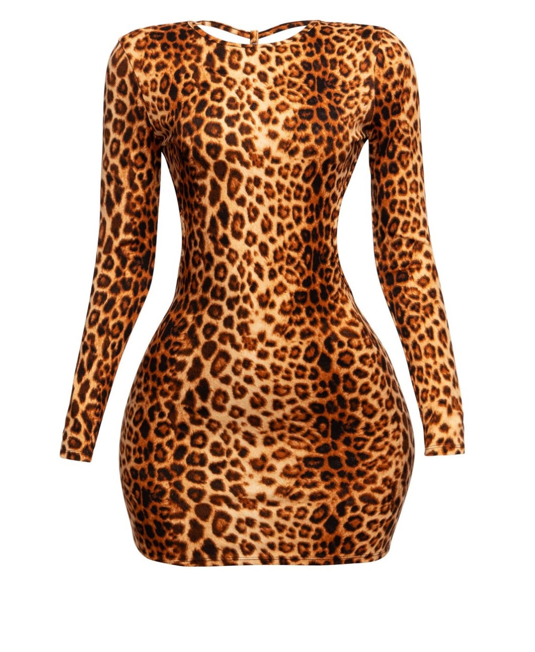 Leopard print bodycon dress. Form-fitting silhouette with back cut out.